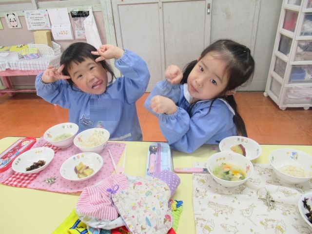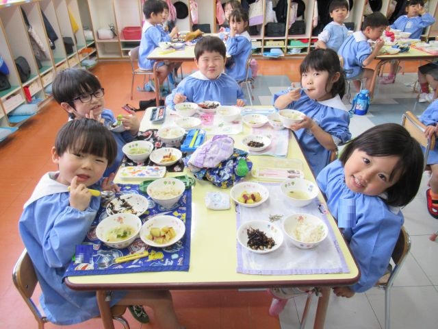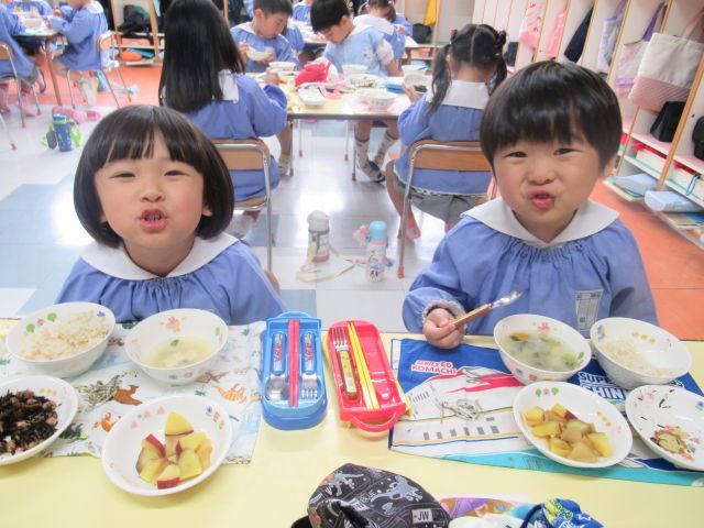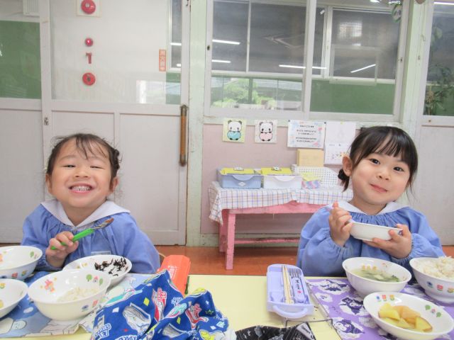 スプーンの持ち方やお皿を持って食べるなどお行儀に気を付けながら頑張って食べています‼