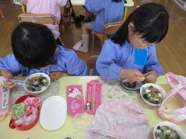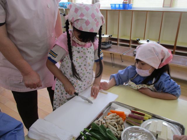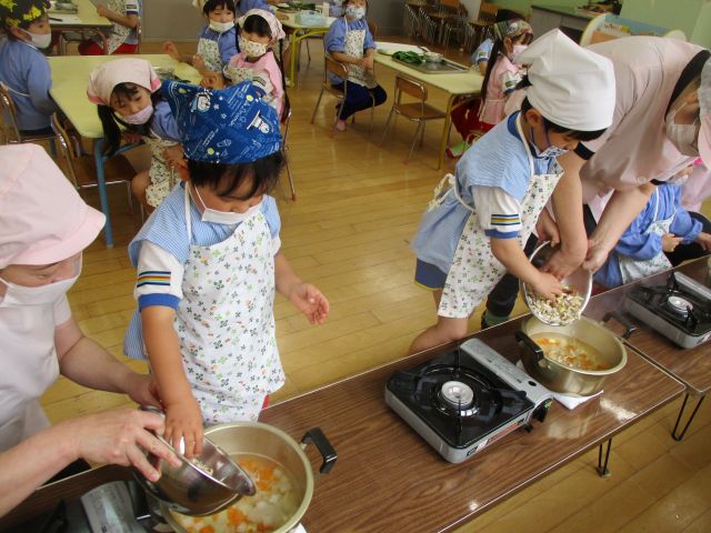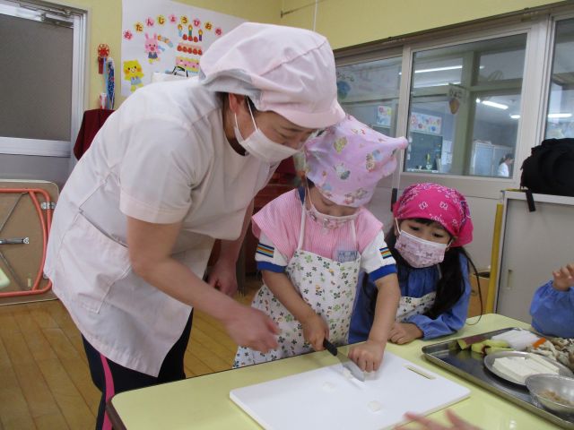 料理教室(つき) 今日は、つき組の料理教室でした!! 年中組の時の料理教室で作った味噌を使っての味噌汁作りでした(^-^) はらわたを取ったいりこをお鍋に入れたり・・・ 包丁を使って野菜を切ったり・・・ 切った野菜をお鍋に入れたり・・・ 楽しく安全にお料理が出来ました!! 愛情たっぷりのお弁当とお味噌汁、美味しかったね♡