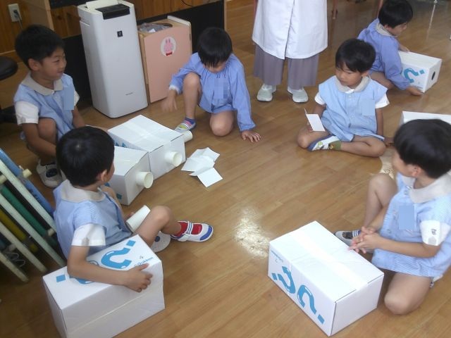「くうきのかたまりをはっしゃ」ということで空気砲を使っての実験を行いました。