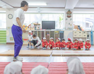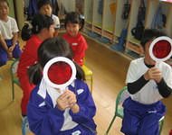 10:20 - 11:30 朝の気持ちの良い時間にしっかりと 午前の保育 保育の始まりは、みんなで楽しくおうたをうたいながら、みほとけさまに手を合わせる「おまいり」からはじまります。 「おまいり」が終わったら、お外で遊んだり、音楽の練習をしたり、季節にあわせた製作など、さまざまな活動を行います。 たかみの保育
